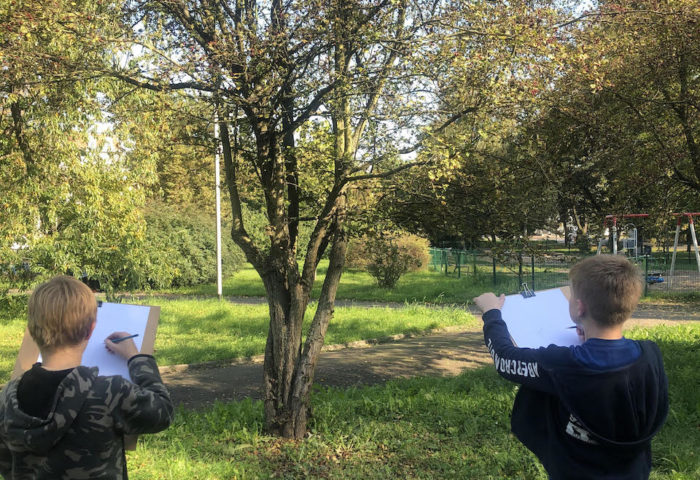 Już za chwilę deszcz i plucha, łapiemy ostatnie promienie słońca i w miarę ciepłe popołudnia. Wychodzimy w plener, rysujemy drzewa i ostatnie liście na nich. A właściwie rysujemy bez liści – najważniejsza jest obserwacja, światło i cień na pniach oraz konarach. Dajemy radę, plener robi swoje.