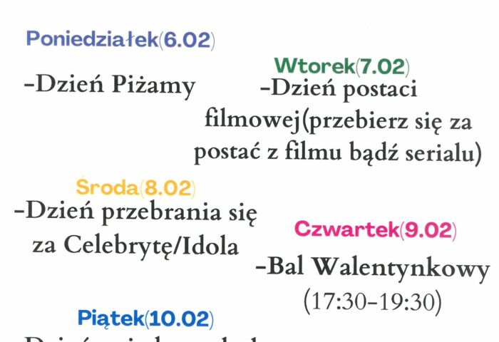 Uwaga! Od 6 lutego do 10 lutego ogłaszamy szalony tydzień karnawałowy w naszej szkole dla klas 4-8. Harmonogram tygodnia wygląda tak: poniedziałek 6.02.: → dzień piżamy wtorek 7.02.: → dzień postaci filmowej (przebierz się za postać z filmu lub serialu) środa 8.02.: → dzień przebrania się za idola lub celebrytę czwartek 9.02.: → bal walentynkowy […]