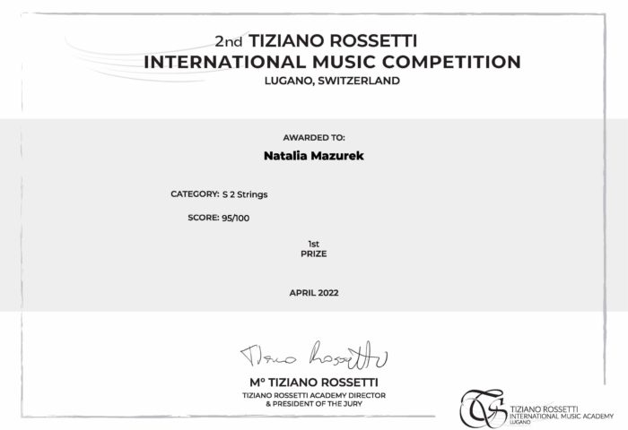 Miło nam poinformować o kolejnych sukcesach naszej uczennicy Natalii Mazurek. Otrzymała ona 1. nagrodę w konkursie Tiziano Rossetti w Szwajcarii za grę na skrzypcach. Dodatkowo wywalczyła 2. nagrodę w konkursie Oberton International Soloist Competition i została zaproszona na koncert laureatów do Austrii. Serdecznie gratulujemy!