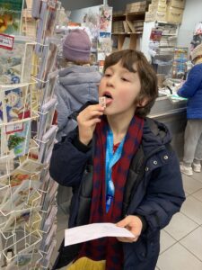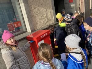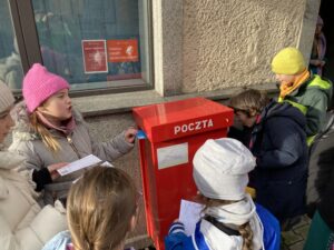Umięjętności adresowania, wyszukiwania kodu pocztowego, zapisywania form grzecznościowych i określania adresata przećwiczyliśmy w praktyce. I to w najprawdziwszej Poczcie przy ulicy Pocztowej! Najprawdziwszej, gdyż miała w sobie wszystko to, co mieć powinna: niewielką kolejkę, czynne wszystkie okienka i znaczki na list. Klasa 4cm spisała się znakomicie – i znakomicie podpisała swe listy do najbliższych. Już niedługo spodziewajcie się w Szczecinie, Wołczkowie, Chojnice, Krakowie, Warszawie korespondencji od pewnych życzliwych dziesięciolatków:)
